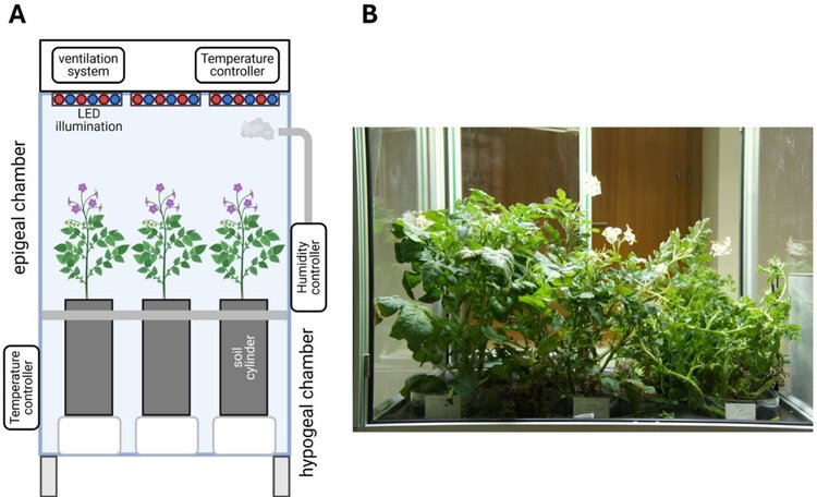 Diagramă a simulatorului de microcosmos și imagine a plantelor cultivate. (A) Diagramă microcosmos. Zona epigeală este dotată cu regulatoare de temperatură, umiditate și iluminare LED, precum și cu un sistem de ventilație; Zona hipogeală este echipată cu cilindri din plastic cu sol și un regulator de temperatură. (B) Fotografii ale plantelor de cartofi cultivate într-unul dintre simulatoarele Microcosmo. De la stânga la dreapta: „Biancona del Faggeto”, „Rossa delle Macchie”, „Quarantina delle Macchie”.